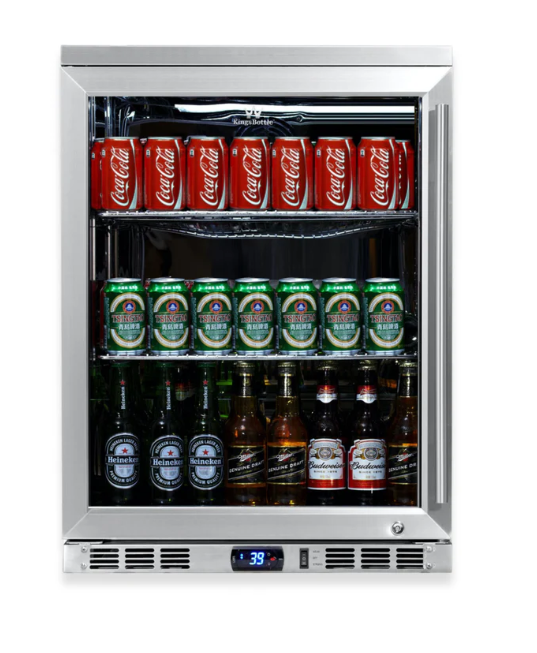 Designed to accommodate up to 140 cans, this sleek unit seamlessly integrates into any under counter space thanks to its front-venting system. Perfect for home bars, entertainment rooms, or covered outdoor areas, this mini beverage fridge combines efficient cooling with elegant design. The self-closing door ensures your beverages stay perfectly chilled while maintaining the clean aesthetics that KingsBottle is known for.