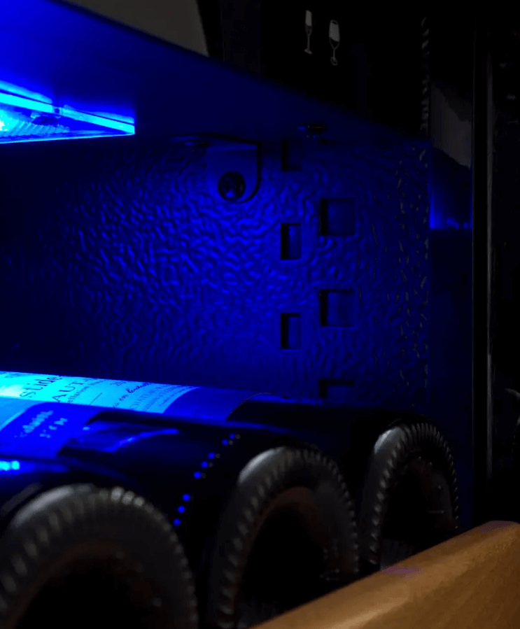 The cabinet boasts two light panels to showcase your wine collection in contemporary fashion. The cool blue LED lights cast a soft glow on your bottles, stylishly illuminating them without the unnecessary heat created from an incandescent bulb.