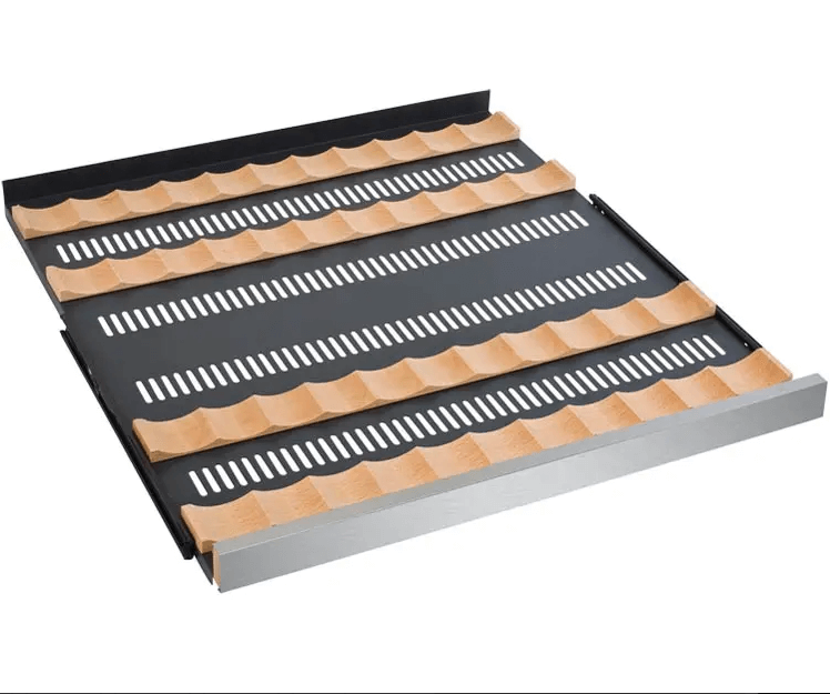 Allavino is at the leading edge of shelf design, incorporating revolutionary metal shelves that are strong enough to hold bottles without sagging, yet thin enough to maximize the available space in the cabinet for wine storage. Wood slats refine each shelf and gently cradle each bottle to prevent harmful vibration from affecting your wine. Each shelf is finished with a stylish stainless steel front to match the door frame. Each of the shelves glide out smoothly on ball bearing tracks, so every bottle is easily accessible.