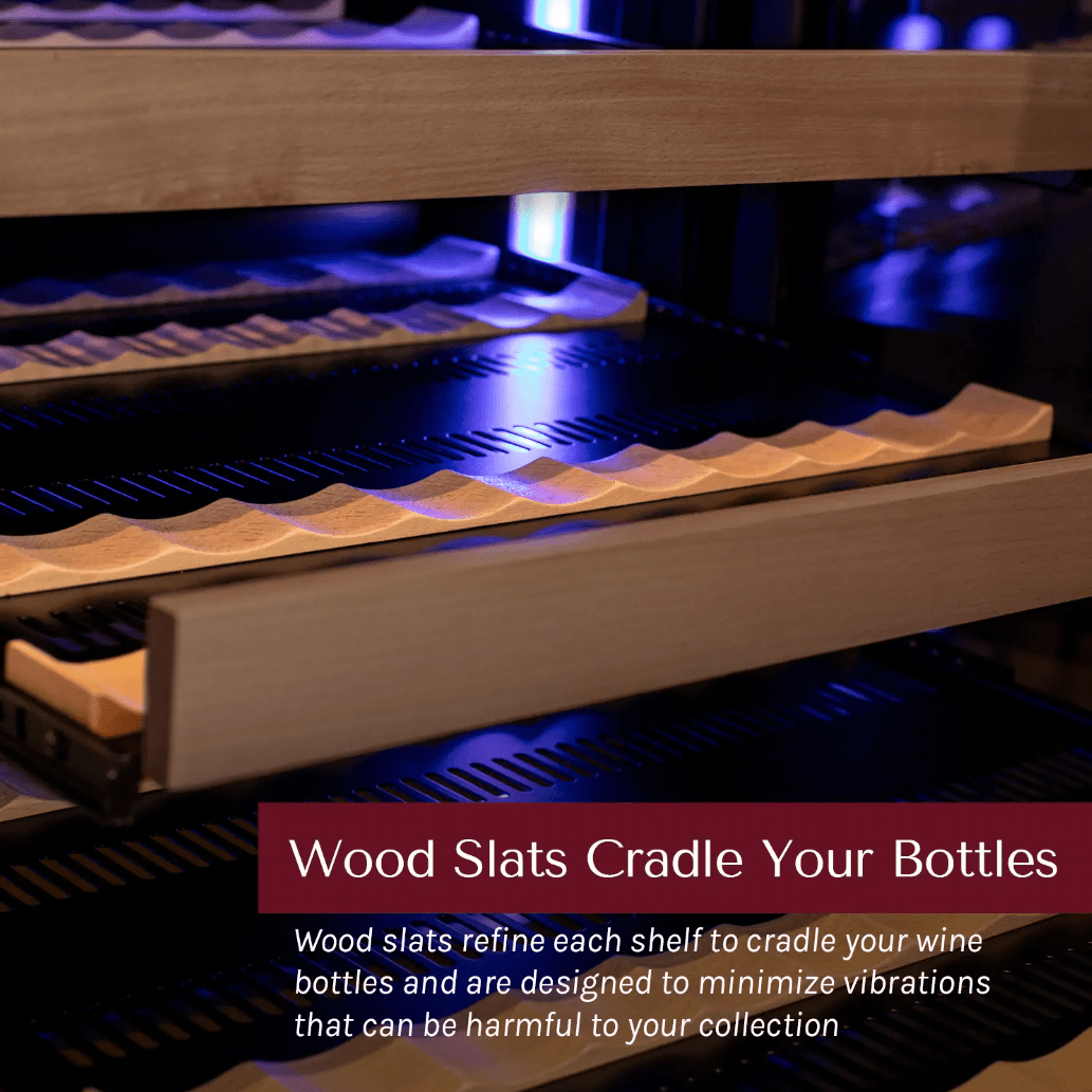 Allavino's exclusive FlexCount shelves give you ultimate flexibility and accessibility, regardless of bottle size. Spacing between each shelf gives you enough clearance to not worry about racks scraping your bottle labels. Wood slats refine each shelf to cradle your wine bottles and are designed with vibration-reduction technology to prevent harmful vibrations from excessive movement and damage.