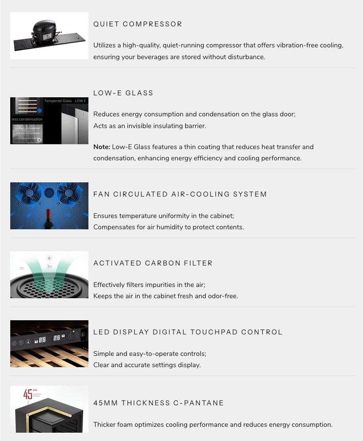 Utilizes a high-quality, quiet-running compressor that offers vibration-free cooling, ensuring your beverages are stored without disturbance.