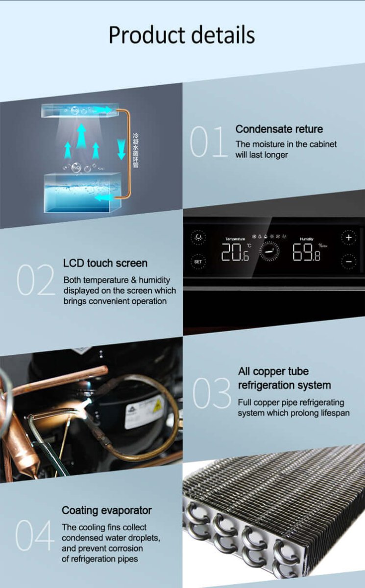 The sophisticated climate system maintains precise conditions between 60-75% humidity and 41°-71.6°F temperature using computerized intelligent control. Powered by an American Embraco high back pressure compressor with innovative "dry and wet separation" technology, the unit prevents condensation while ensuring even air distribution through its fan-shaped duct system. The advanced plant fiber polymer wet membrane provides efficient humidification with large capacity for multi-box storage.