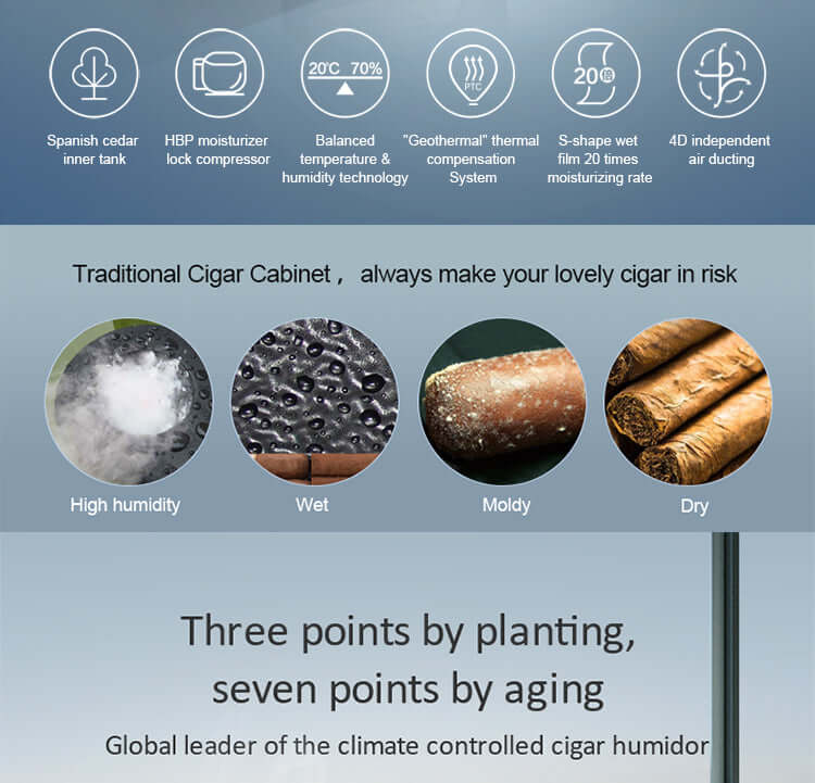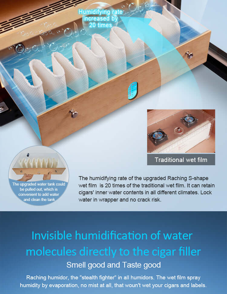 Traditional metal-lined cigar cabinets frequently develop problematic condensation buildup. In contrast, Raching cabinets feature complete Spanish cedar wood interiors that properly alcoholize cigars while preventing condensation formation. This natural material provides superior moisture regulation through enhanced absorption and release properties, effectively maintaining optimal humidity levels throughout the cabinet environment.