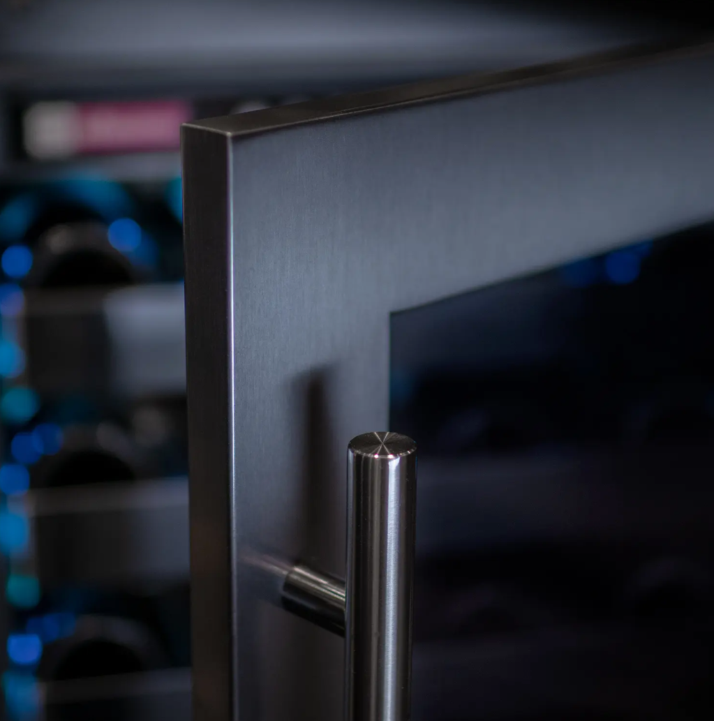 The seamless framed black stainless doors showcase an elegant and clean profile while also resisting visible fingerprints. The tinted low-emissivity glass protects your wine from the harmful effects of UV light.