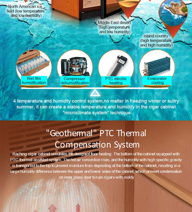 Additional premium features of raching climate controlled cigar humidors include PTC heating for cold-weather operation, external LCD control panel, frameless tempered double-glass door, security lock, and adaptable cedar shelving for both loose and box-packed cigars. This professional-grade humidor delivers exceptional cigar preservation with customizable options to meet specific collector requirements.