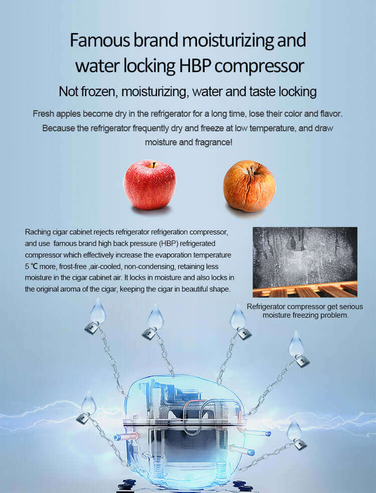 Raching cigar cabinets feature premium American Embraco medium and high-pressure compressors. This advanced system cools without freezing, reducing air moisture during cooling cycles and delivering significantly more stable humidity levels than conventional cigar storage solutions.