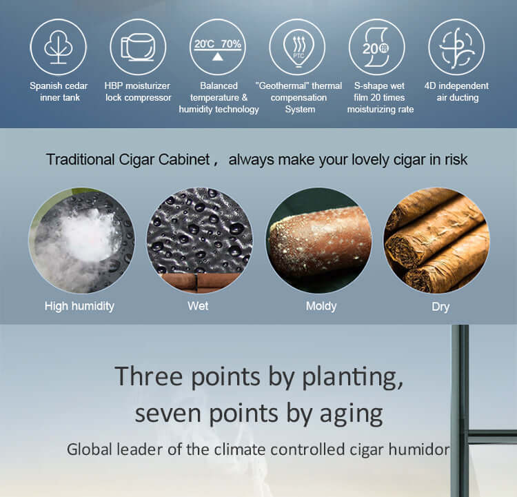 Traditional metal-lined cigar cabinets frequently develop problematic condensation buildup. In contrast, Raching cabinets feature complete Spanish cedar wood interiors that properly alcoholize cigars while preventing condensation formation. This natural material provides superior moisture regulation through enhanced absorption and release properties, effectively maintaining optimal humidity levels throughout the cabinet environment.
